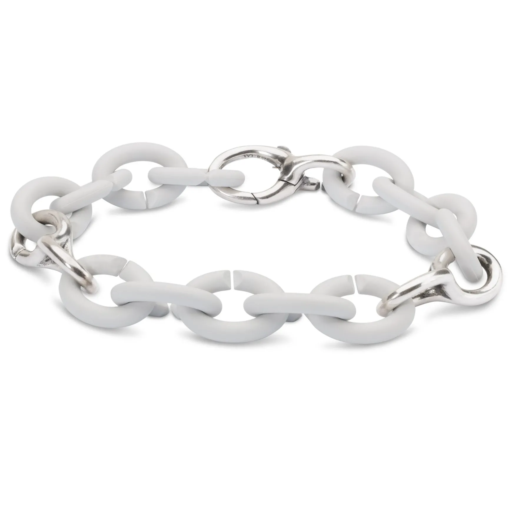 This stylish bracelet consists of fifteen Rubber X links combined with two Basic Double Silver Links and a Basic Silver Lock made of 100% Sterling silver.